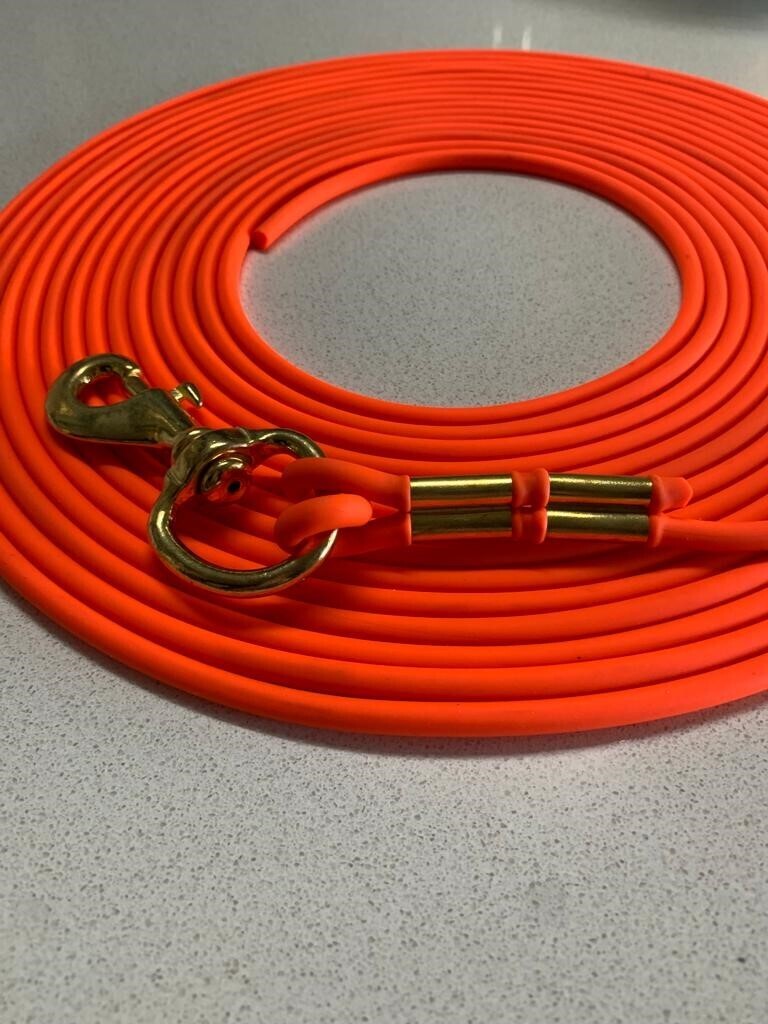 This item is a high quality 10-meter Biothane rope lead (only available in orange). Perfect for tracking and trailing work. The lead is easy to clean, provides an amazing grip and does not pick up thorns and twigs unlike regular cotton leads.